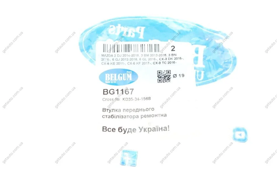 Втулка переднього стабілізатора MAZDA 2 DJ 2014-2018, 3 BM 2013-2016, 3 BN 2016-, 6 GJ 2012-2016, 6 GL 2016-, CX-3 DK 2015-, CX-5 KE 2011-, CX-5 KF 20 BELGUM PARTS BG1167