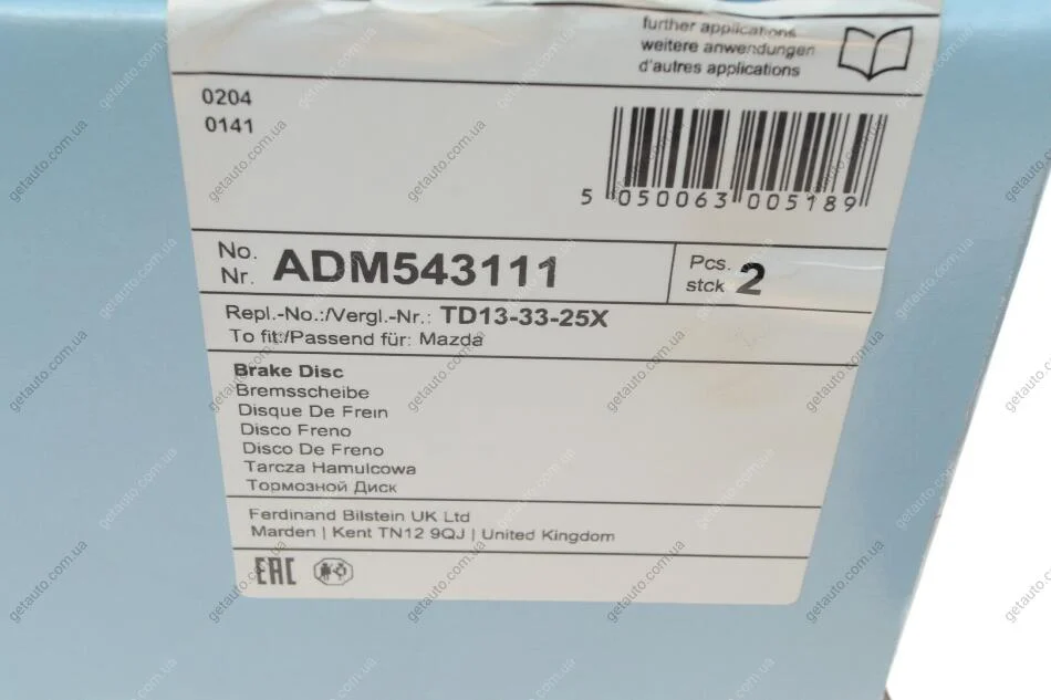 Диск гальмівний передній Mazda BLUE PRINT ADM543111