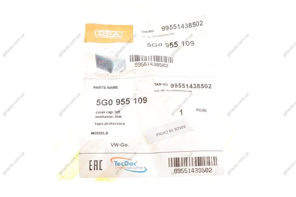 Кришка форсунки омивача фари ліва VW Golf VII (5G1, BQ1, BE1, BE2) (12-) DPA 99551438502