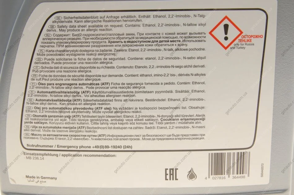 Специфікація: ATF4134, MB 236.14, ATF III H plus