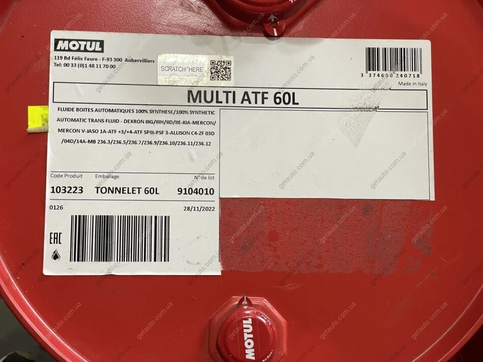 Специфікація: ATF Dexron III H, AISIN JWS 3309, AISIN JWS 3314, Allision C-4, Allision TES 295, Allision TES 389, Nissan Matic-D/J/K, Chrysler ATF+3/+4, Ford Mercon. MerconV, Ford WSS-M2C924-A, Ford WSS-M2C938-A, Ford M2C195-A, Ford M2C202-B, Ford M2C922-A1, MAN 339 Type V1/Z2, MAN 339 Type V2/Z3, MB 235.71, MB 236.6, MB 236.9, MB 236.10, MB 236.11, VW G 050 160, VW G 052 162, VW G 052 990, VW G 055 025, ZF TE-ML 04D. 14B, ZF TE-ML 17C. 02F, ZF TE-ML 11B. 14C, BMW LA-2634, BMW LT-71141, BMW ETL 7045 E