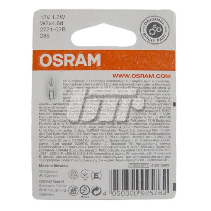 ЛАМПА 12V 1,20 W W2x4.6d BLI STANDARD OSRAM 2721-02b