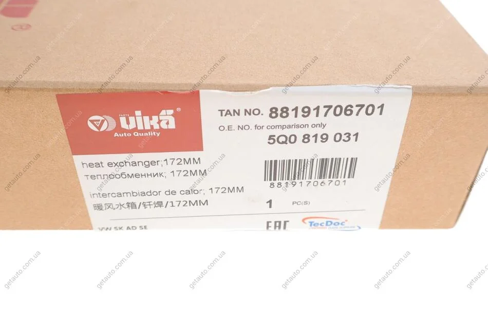 Радіатор пічки 172 мм Skoda Octavia (13-21)/VW GOLF (13-20), Passat (15 -), Tiguan (16 -)/Audi A3 (13-20) Vika 88191706701