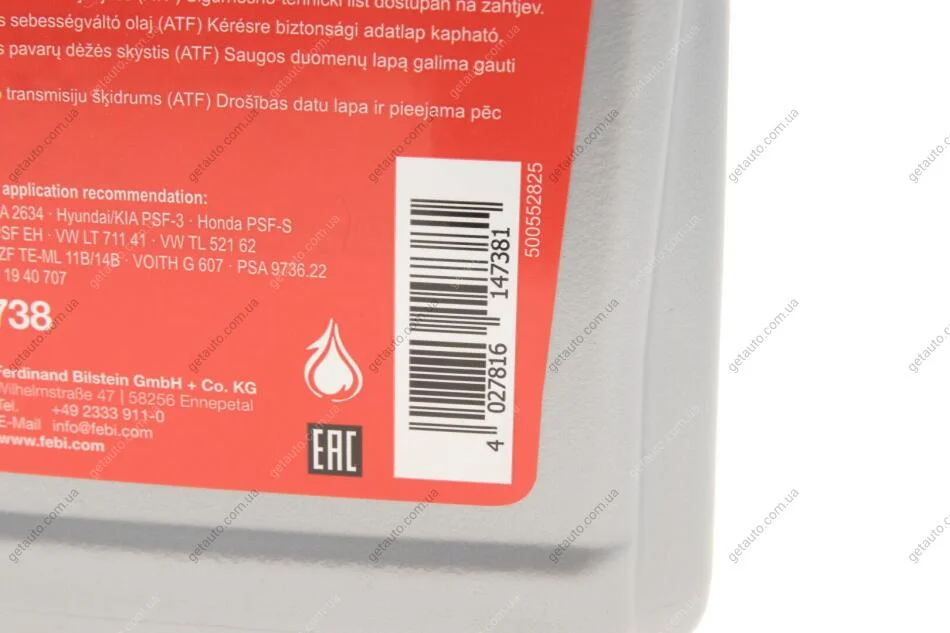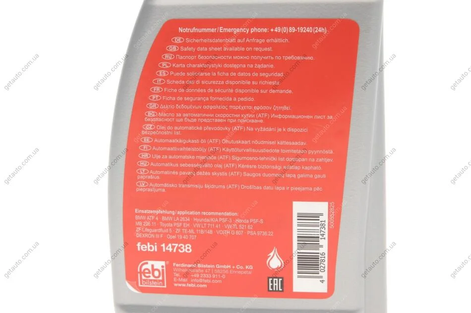Спецификация: ATF Dexron III H, AISIN JWS 3309, AISIN JWS 3314, Allision C-4, Allision TES 295, Allision TES 389, Nissan Matic-D/J/K, Chrysler ATF+3/+4, Ford Mercon. MerconV, Ford WSS-M2C924-A, Ford WSS-M2C938-A, Ford M2C195-A, Ford M2C202-B, Ford M2C922-A1, MAN 339 Type V1/Z2, MAN 339 Type V2/Z3, MB 235.71, MB 236.6, MB 236.9, MB 236.10, MB 236.11, VW G 050 160, VW G 052 162, VW G 052 990, VW G 055 025, ZF TE-ML 04D. 14B, ZF TE-ML 17C. 02F, ZF TE-ML 11B. 14C, BMW LA-2634, BMW LT-71141, BMW ETL 7045 E