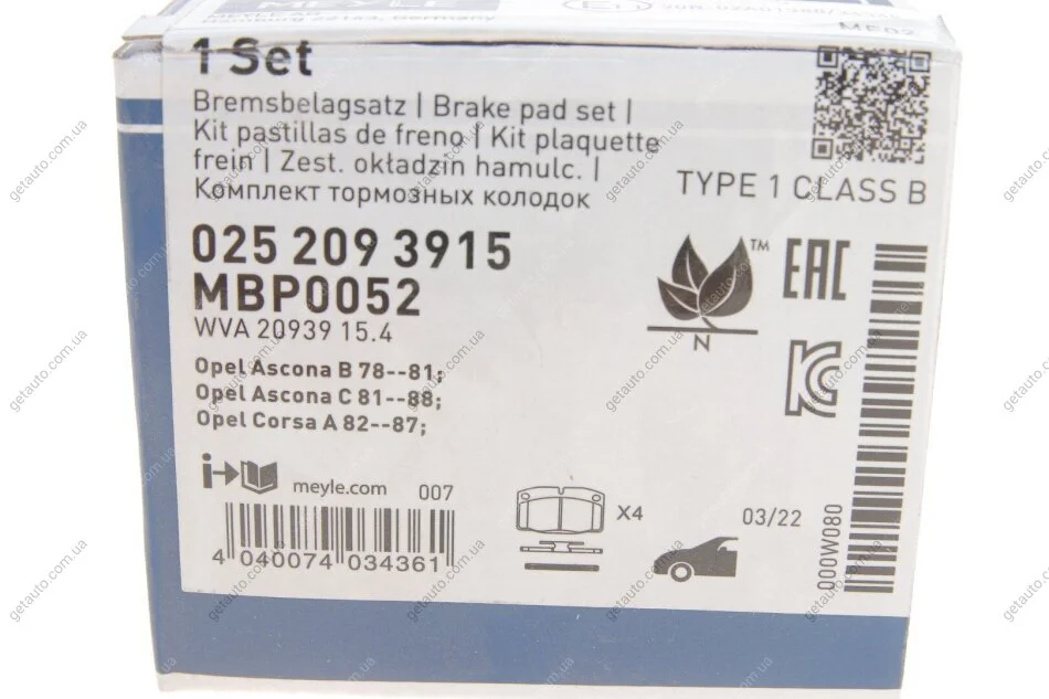 Комплект гальмівних колодок MEYLE 025 209 3915