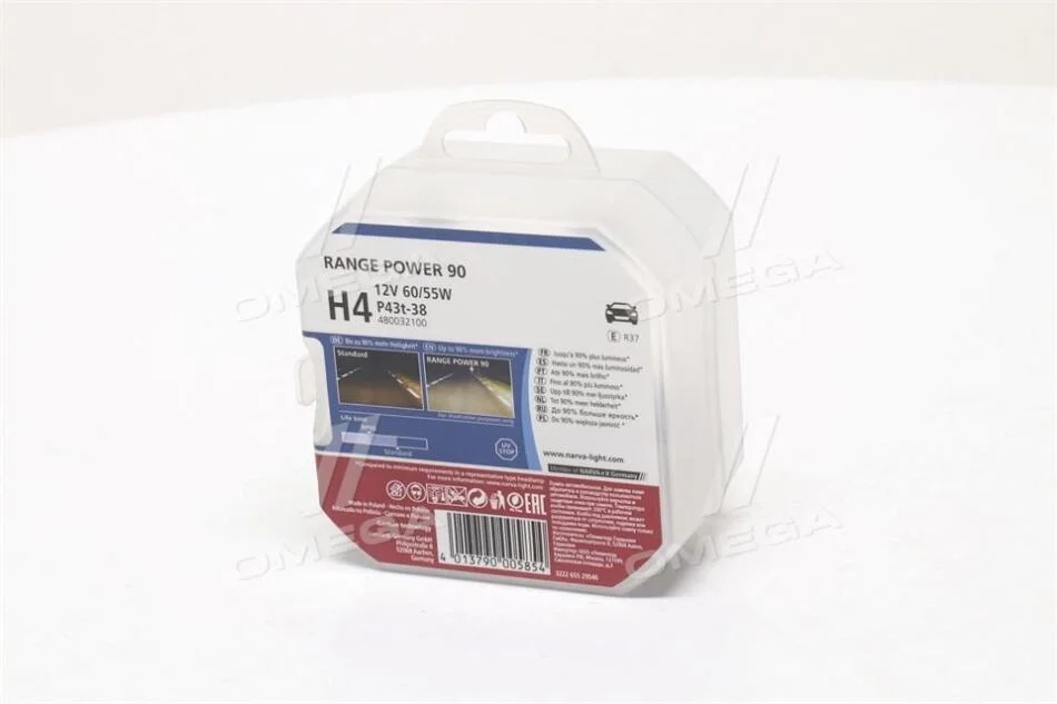 Лампа розжарювання SET H4 12V 60/55 W P43t RANGE POWER +90 (к-т 2шт) NARVA 48003S2